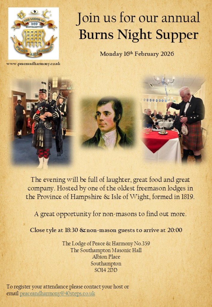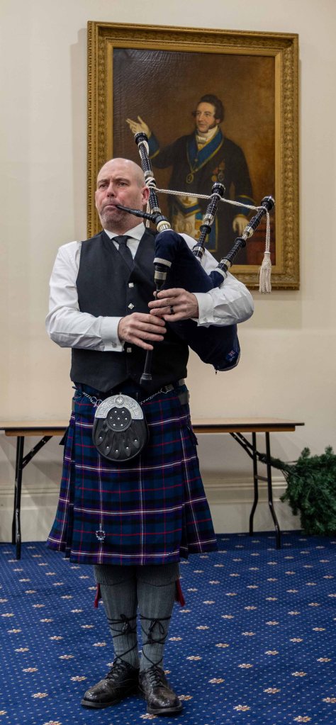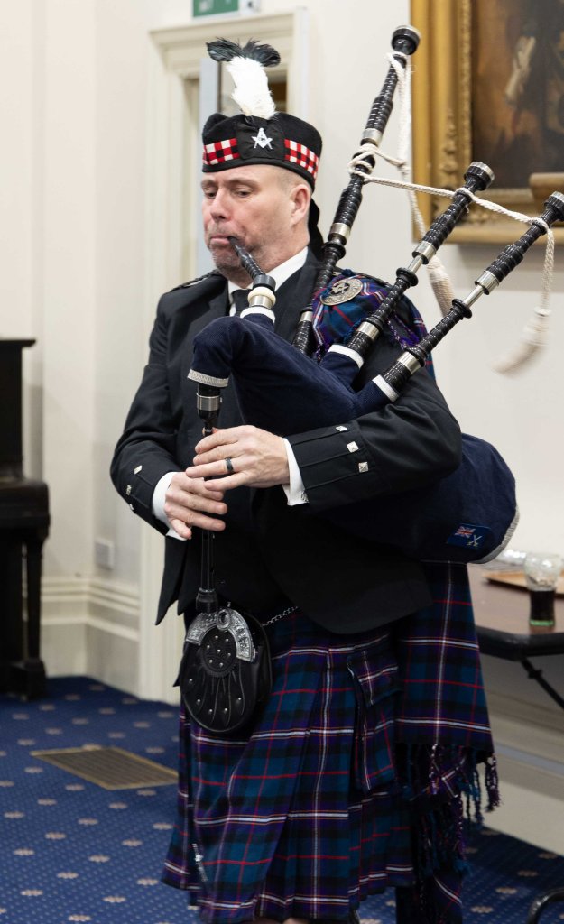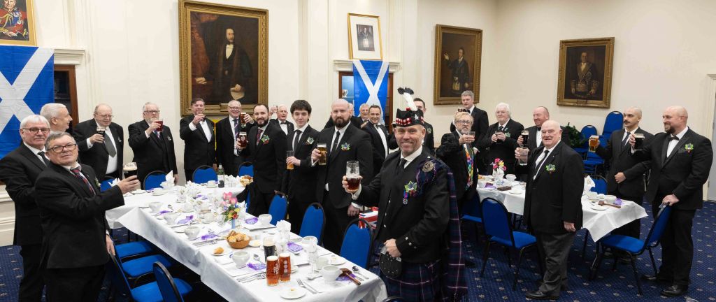 Our Festive Board was themed as usual with this month being our Burns Supper heralded in by our own resident piper and the Address to the Haggis duly executed before enjoying an excellent meal. We were delighted to welcome amongst us for dinner six young non-masons all of whom enjoyed the evening with a number expressing their interest in joining us at some time in the near future. Inviting these keen young men to join us for our festive board is a regular feature in Peace & Harmony which we have found introduces them into the camaraderie and friendship so abundant in the Craft, we look forward to their further engagement with us in the months ahead.