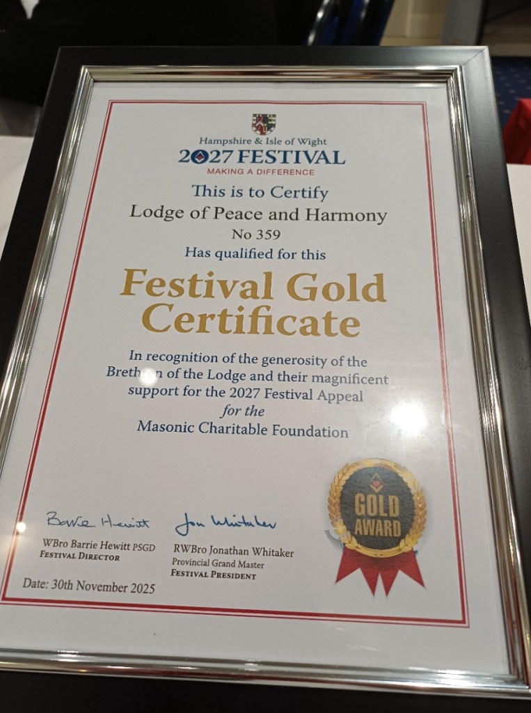 Our first meeting of 2026 last evening was a Proclamation for our Worshipful Master who was continuing in the Chair for a consecutive year and an excellent evening it proved to be. With our APGM in attendance, the lodge was presented with our GOLD certificate for the MCF 2027 Festival, no small feat for a small lodge such as ours but it demonstrates the generosity of spirit within our members.